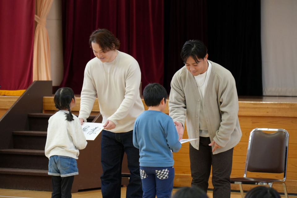 11月19日に、京極小学校で「北海道応援大使プロジェクト選手交流会2025」が行われました。 北海道日本ハムファイターズから生田目投手と河野投手にお越しいただき、質問コーナーや児童とのキャッチボール、選手によるデモンストレーションなどが実施されました。 最後には、選手の皆さんから児童へメッセージが贈られ、児童たちにとって思い出に残る交流会となりました。